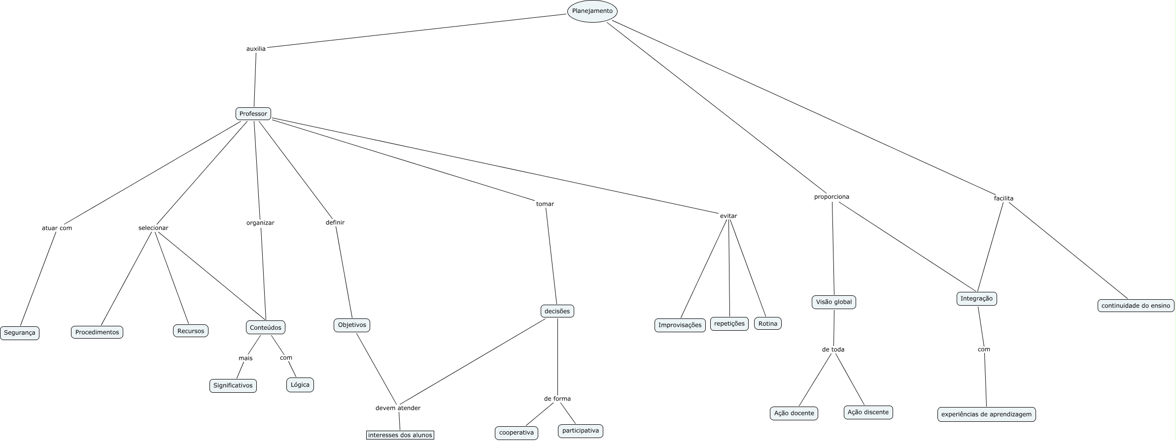 visão geral, Professor selecionar Recursos, Professor tomar decisões, Conteúdos com Lógica, Visão global de toda Ação docente, Planejamento facilita Integração, decisões de forma cooperativa, Professor atuar com Segurança, Visão global de toda Ação discente, Professor definir Objetivos, Integração com experiências de aprendizagem