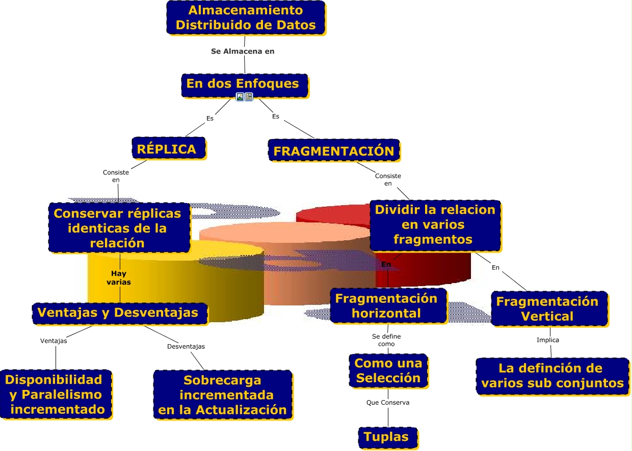 Almacenamiento Distribuido, Almacenamiento Distribuido de Datos Se Almacena en En dos Enfoques, Fragmentación horizontal Se define como Como una Selección, Ventajas y Desventajas Ventajas Disponibilidad y Paralelismo incrementado, Dividir la relacion en varios fragmentos En Fragmentación horizontal, En dos Enfoques Es FRAGMENTACIÓN, Dividir la relacion en varios fragmentos En Fragmentación Vertical, Conservar réplicas identicas de la relación Hay varias Ventajas y Desventajas, Como una Selección Que Conserva Tuplas, Ventajas y Desventajas Desventajas Sobrecarga incrementada en la Actualización, RÉPLICA Consiste en Conservar réplicas identicas de la relación