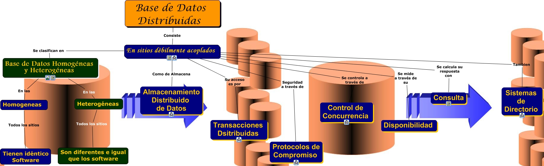 Parcial II, Base de Datos Homogéneas y Heterogéneas En las Homogeneas, Base de Datos Distribuidas Consiste En sitios débilmente acoplados, Base de Datos Homogéneas y Heterogéneas En las Heterogéneas, Heterogéneas Todos los sitios Son diferentes e igual que los software, En sitios débilmente acoplados Seguridad a través de Protocolos de Compromiso, En sitios débilmente acoplados Tambien Sistemas de Directorio, En sitios débilmente acoplados Se clasifican en Base de Datos Homogéneas y Heterogéneas, En sitios débilmente acoplados Se mide a través de su Disponibilidad, Homogeneas Todos los sitios Tienen idéntico Software, En sitios débilmente acoplados Se calcula su respuesta con Consulta
