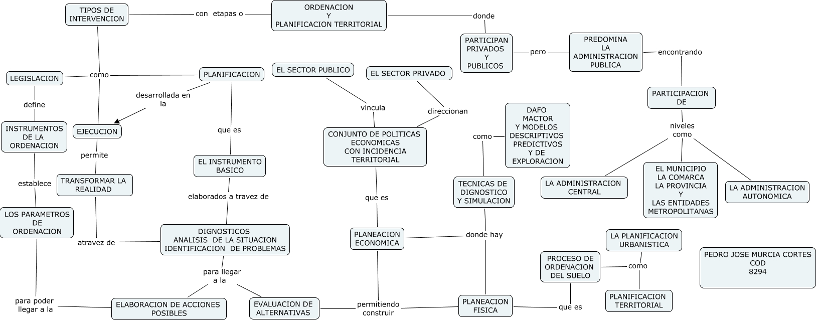 ordenacion y planificacion territorial cap 1y2 pedro mucia, ORDENACION Y PLANIFICACION TERRITORIAL donde PARTICIPAN PRIVADOS Y PUBLICOS, PREDOMINA LA ADMINISTRACION PUBLICA encontrando PARTICIPACION DE, PLANEACION FISICA que es PROCESO DE ORDENACION DEL SUELO, ORDENACION Y PLANIFICACION TERRITORIAL con etapas o TIPOS DE INTERVENCION, TIPOS DE INTERVENCION como LEGISLACION, PLANIFICACION desarrollada en la EJECUCION, PLANEACION ECONOMICA que es CONJUNTO DE POLITICAS ECONOMICAS CON INCIDENCIA TERRITORIAL, PLANEACION ECONOMICA donde hay PLANEACION FISICA, TECNICAS DE DIGNOSTICO Y SIMULACION como DAFO MACTOR Y MODELOS DESCRIPTIVOS PREDICTIVOS Y DE EXPLORACION, PROCESO DE ORDENACION DEL SUELO como PLANIFICACION TERRITORIAL