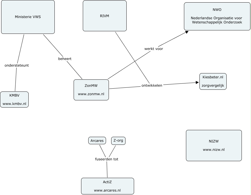 Health Sector Ecology, Arcares fuseerden tot ActiZ www.arcares.nl, ZonMW www.zonmw.nl werkt voor NWO Nederlandse Organisatie voor Wetenschappelijk Onderzoek, Ministerie VWS beheert ZonMW www.zonmw.nl, ZonMW www.zonmw.nl ontwikkelen Kiesbeter.nl zorgvergelijk, Ministerie VWS ondersteteunt KMBV www.kmbv.nl, Z-org fuseerden tot ActiZ www.arcares.nl, RIVM ontwikkelen Kiesbeter.nl zorgvergelijk