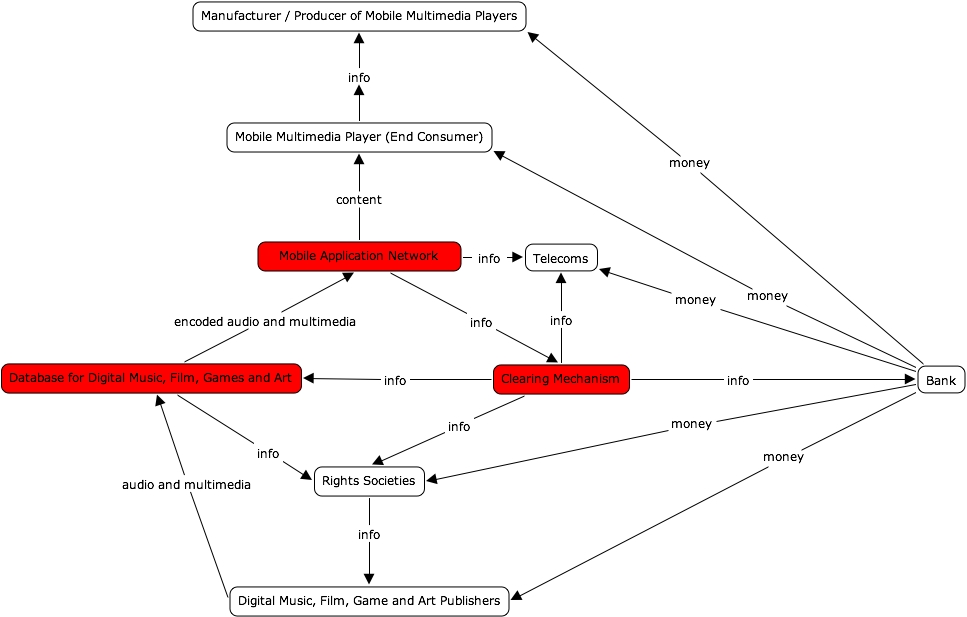 Concept Map, Bank money Digital Music, Film, Game and Art Publishers, Bank money Rights Societies, Clearing Mechanism info Bank, Mobile Application Network info Telecoms, Mobile Application Network info Telecoms, Bank money Mobile Multimedia Player (End Consumer), Database for Digital Music, Film, Games and Art encoded audio and multimedia Mobile Application Network, Rights Societies info Digital Music, Film, Game and Art Publishers, Bank money Telecoms, Mobile Application Network info Clearing Mechanism
