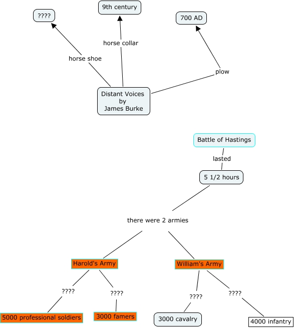 Barbara's Team, Distant Voices by James Burke horse collar 9th century, William's Army ???? 3000 cavalry, 5 1/2 hours there were 2 armies William's Army, Distant Voices by James Burke plow 700 AD, Distant Voices by James Burke horse shoe ????, Harold's Army ???? 5000 professional soldiers, William's Army ???? 4000 infantry, Harold's Army ???? 3000 famers, 5 1/2 hours there were 2 armies Harold's Army, Battle of Hastings lasted 5 1/2 hours
