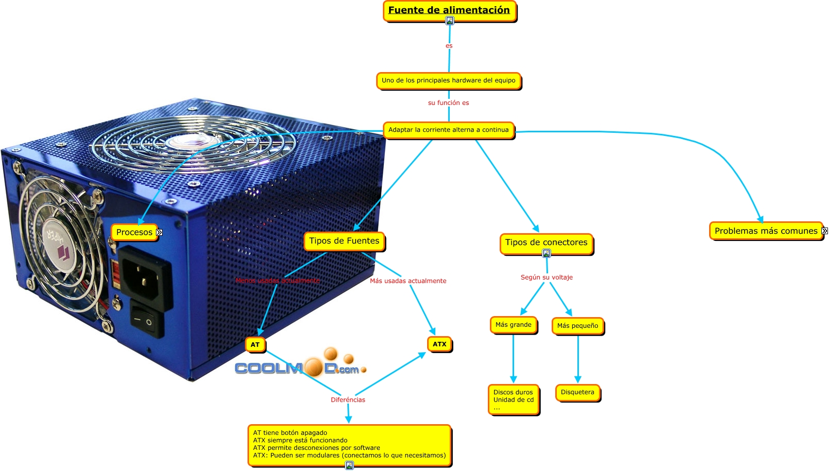 Fuentes de alimentación, Adaptar la corriente alterna a continua ???? Tipos de conectores, Adaptar la corriente alterna a continua ???? Problemas más comunes, Filtrado Consiste en Aplanar la señal (sin oscilaciones), Adaptar la corriente alterna a continua Procesos Transformación, Tipos de conectores Según su voltaje Más grande, Fuente de alimentación es Uno de los principales hardware del equipo, Tipos de conectores Según su voltaje Más pequeño, Tipos de Fuentes Más usadas actualmente ATX, Adaptar la corriente alterna a continua ???? Tipos de Fuentes, Rectificación Consiste en Corriente alterna -> Corriente contínua