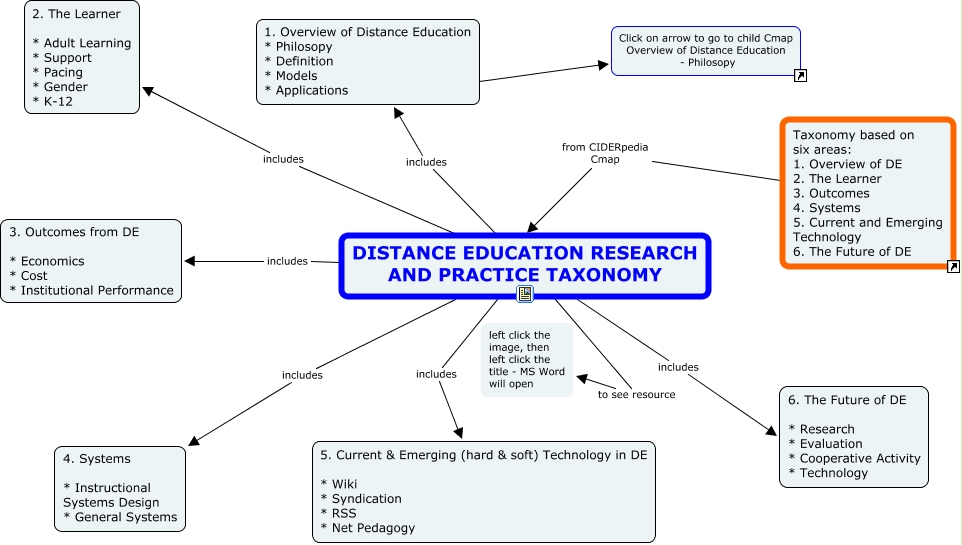 CIDERpedia - Distance Education Research and Practice Taxonomy, DISTANCE EDUCATION RESEARCH AND PRACTICE TAXONOMY includes 1. Overview of Distance Education * Philosopy * Definition * Models * Applications, DISTANCE EDUCATION RESEARCH AND PRACTICE TAXONOMY includes 3. Outcomes from DE * Economics * Cost * Institutional Performance, Taxonomy based on six areas: 1. Overview of DE 2. The Learner 3. Outcomes 4. Systems 5. Current and Emerging Technology 6. The Future of DE from CIDERpedia Cmap DISTANCE EDUCATION RESEARCH AND PRACTICE TAXONOMY, DISTANCE EDUCATION RESEARCH AND PRACTICE TAXONOMY to see resource left click the image, then left click the title - MS Word will open, DISTANCE EDUCATION RESEARCH AND PRACTICE TAXONOMY includes 4. Systems * Instructional Systems Design * General Systems, DISTANCE EDUCATION RESEARCH AND PRACTICE TAXONOMY includes 2. The Learner * Adult Learning * Support * Pacing * Gender * K-12, 1. Overview of Distance Education * Philosopy * Definition * Models * Applications ???? Click on arrow to go to child Cmap Overview of Distance Education - Philosopy, DISTANCE EDUCATION RESEARCH AND PRACTICE TAXONOMY includes 6. The Future of DE * Research * Evaluation * Cooperative Activity * Technology, DISTANCE EDUCATION RESEARCH AND PRACTICE TAXONOMY includes 5. Current & Emerging (hard & soft) Technology in DE * Wiki * Syndication * RSS * Net Pedagogy