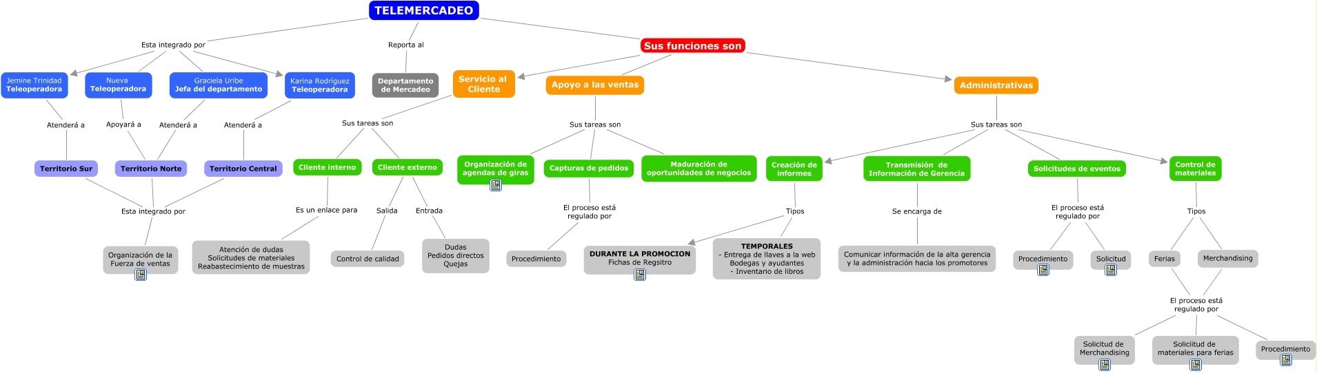 Telemercadeo ST, TELEMERCADEO Esta integrado por Jemine Trinidad Teleoperadora, Territorio Norte Esta integrado por Organización de la Fuerza de ventas, Control de materiales Tipos Ferias, Administrativas Sus tareas son Creación de informes, TELEMERCADEO Esta integrado por Graciela Uribe Jefa del departamento, Creación de informes Tipos DURANTE LA PROMOCION Fichas de Regsitro, Transmisión de Información de Gerencia Se encarga de Comunicar información de la alta gerencia y la administración hacia los promotores, Ferias El proceso está regulado por Soliciitud de materiales para ferias, Creación de informes Tipos TEMPORALES - Entrega de llaves a la web Bodegas y ayudantes - Inventario de libros, Ferias El proceso está regulado por Procedimiento