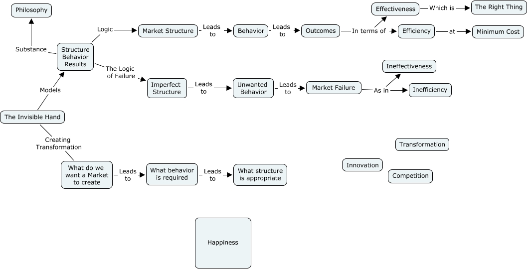 Market Mechanisms, Outcomes In terms of Effectiveness, Market Structure Leads to Behavior, The Invisible Hand Models Structure Behavior Results, What do we want a Market to create Leads to What behavior is required, Behavior Leads to Outcomes, Efficiency at Minimum Cost, The Invisible Hand Creating Transformation What do we want a Market to create, Market Failure As in Inefficiency, Unwanted Behavior Leads to Market Failure, Imperfect Structure Leads to Unwanted Behavior