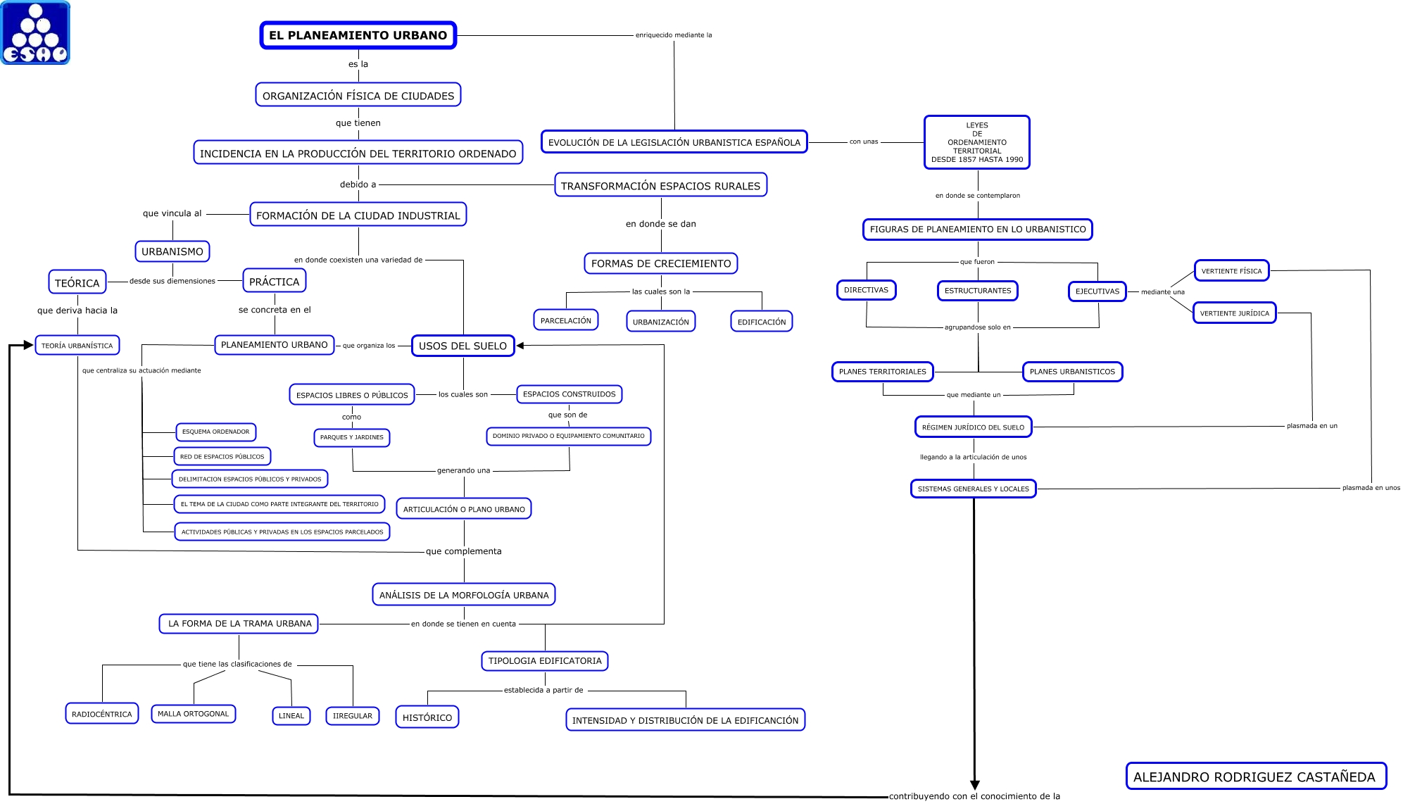 PLANEAMIENTO URBANO_ALEJO RODRIGUEZ 8310, USOS DEL SUELO los cuales son ESPACIOS LIBRES O PÚBLICOS, ANÁLISIS DE LA MORFOLOGÍA URBANA en donde se tienen en cuenta TIPOLOGIA EDIFICATORIA, VERTIENTE FÍSICA plasmada en unos SISTEMAS GENERALES Y LOCALES, LA FORMA DE LA TRAMA URBANA que tiene las clasificaciones de MALLA ORTOGONAL, EVOLUCIÓN DE LA LEGISLACIÓN URBANISTICA ESPAÑOLA con unas LEYES DE ORDENAMIENTO TERRITORIAL DESDE 1857 HASTA 1990, ARTICULACIÓN O PLANO URBANO que complementa ANÁLISIS DE LA MORFOLOGÍA URBANA, FIGURAS DE PLANEAMIENTO EN LO URBANISTICO que fueron EJECUTIVAS, FORMAS DE CRECIEMIENTO las cuales son la PARCELACIÓN, EL PLANEAMIENTO URBANO es la ORGANIZACIÓN FÍSICA DE CIUDADES, DIRECTIVAS agrupandose solo en PLANES TERRITORIALES