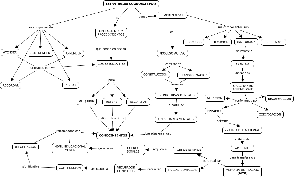 Estrategias Cognoscitivas, MEMORIA DE TRABAJO (MCP) para realizar TAREAS BASICAS, ESTRUCTURAS MENTALES a partir de ACTIVIDADES MENTALES, RECUPERAR CONOCIMIENTOS, COMPRENDER utilizados por LOS ESTUDIANTES, EL APRENDIZAJE sus componentes son RESULTADOS, TAREAS COMPLEJAS requieren RECUERDOS COMPLEJOS, EVENTOS diseƱados FACILITAR EL APRENDIZAJE, ESTRATEGIAS COGNOSCITIVAS se componen de ATENDER, LOS ESTUDIANTES para ADQUIRIR, FACILITAR EL APRENDIZAJE conformado por RECUPERACION