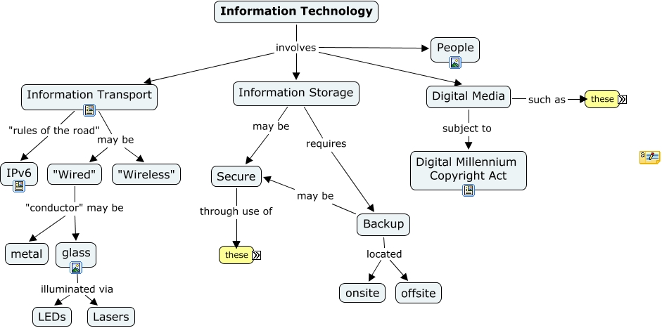 scratch1 Information Technology, Information Transport "rules of the road" IPv6, Information Technology involves Digital Media, Backup located onsite, Information Technology involves Information Storage, Secure through use of Limited Access, Information Storage may be Secure, Digital Media subject to Digital Millennium Copyright Act, "Wired" "conductor" may be metal, "Wired" "conductor" may be glass, glass illuminated via LEDs