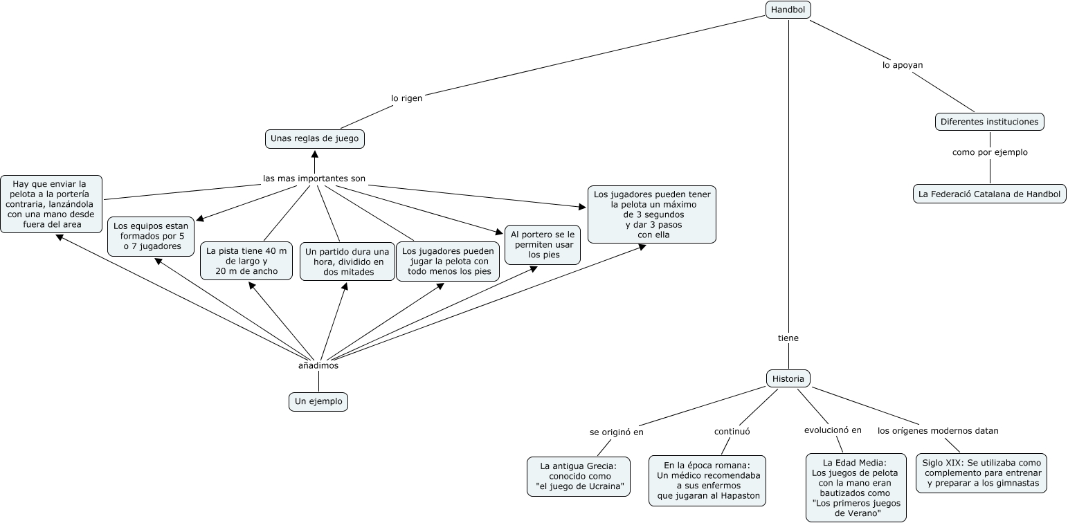 Handbol, Un ejemplo añadimos Hay que enviar la pelota a la portería contraria, lanzándola con una mano desde fuera del area, Historia evolucionó en La Edad Media: Los juegos de pelota con la mano eran bautizados como "Los primeros juegos de Verano", Handbol lo rigen Unas reglas de juego, Un ejemplo añadimos Los jugadores pueden jugar la pelota con todo menos los pies, Historia se originó en La antigua Grecia: conocido como "el juego de Ucraina", Historia continuó En la época romana: Un médico recomendaba a sus enfermos que jugaran al Hapaston, Historia los orígenes modernos datan Siglo XIX: Se utilizaba como complemento para entrenar y preparar a los gimnastas, Un ejemplo añadimos Un partido dura una hora, dividido en dos mitades, Hay que enviar la pelota a la portería contraria, lanzándola con una mano desde fuera del area las mas importantes son Los equipos estan formados por 5 o 7 jugadores, Hay que enviar la pelota a la portería contraria, lanzándola con una mano desde fuera del area las mas importantes son Unas reglas de juego