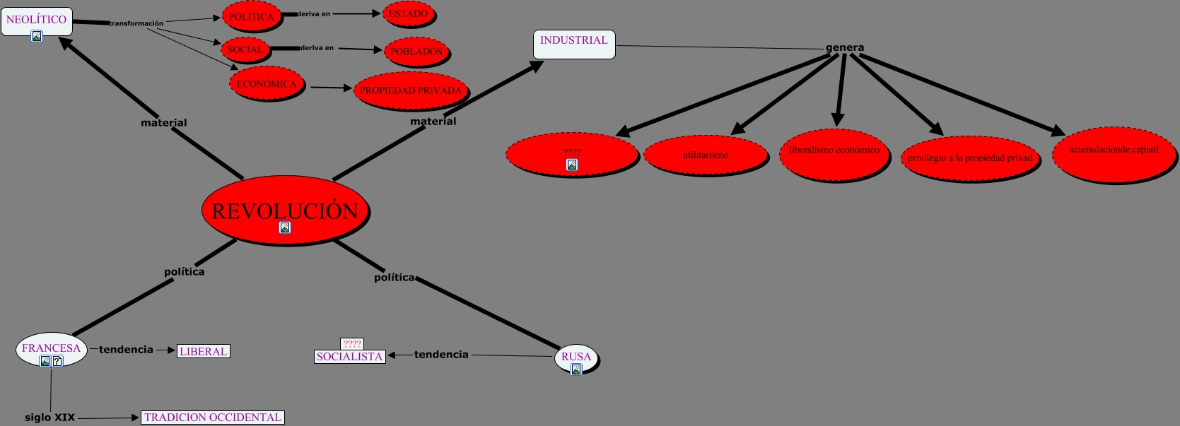 REVOLUCIÓN, FRANCESA siglo XIX TRADICION OCCIDENTAL, SOCIAL deriva en POBLADOS, REVOLUCIÓN política FRANCESA, FRANCESA tendencia LIBERAL, NEOLÍTICO transformación ECONÓMICA, RUSA tendencia SOCIALISTA, INDUSTRIAL genera liberalismo económico, REVOLUCIÓN material NEOLÍTICO, POLÍTICA deriva en ESTADO, INDUSTRIAL genera privilegio a la propiedad privad