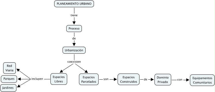 PLANEAMIENTO URBANO, Espacios Construidos de Dominio Privado, Urbanización coexisten Espacios Libres, Proceso de Urbanización, Espacios Parcelados son Espacios Construidos, Espacios Libres incluyen Parques, Espacios Libres incluyen Red Viaria, Urbanización coexisten Espacios Parcelados, Espacios Libres incluyen Jardines, PLANEAMIENTO URBANO tiene Proceso, Dominio Privado con Equipamentos Comunitarios