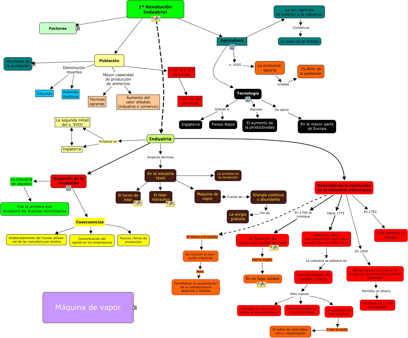 Rev. Ind_, La segunda mitad del s. XVIII Inglaterra, Desarollo de la revolución en la industría ciderurgica En 1783 Cort patenta su forjado, Tecnología Permite El aumento de la productividad, El vapor a presión se introduce en el cilindro Arastrando El pistón en su expansión, Factores Sólo en algunos paises, Población La movilidad de la población Inglaterra, Agricultura ???? Tecnología, Los yacimiento de carbón y hierro Esto supuso Mayores beneficios, menores costes, Desarollo de la revolución La industría de algodón Fue la primera que incorporó los avances tecnológicos, Maquina de vapor ???? Evolución Histórica