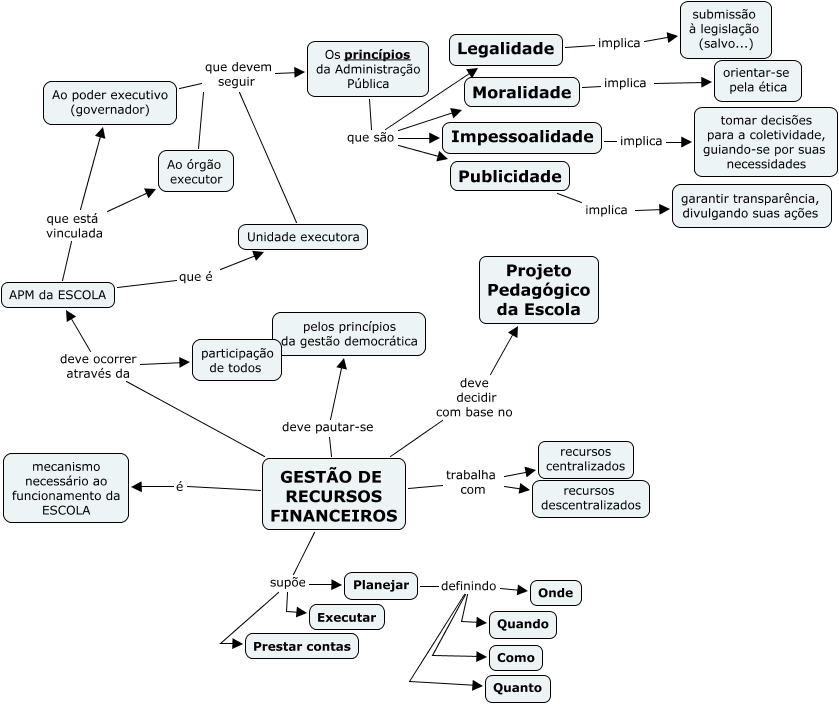 Recursos Financeiros, APM da ESCOLA que é Unidade executora, Impessoalidade implica tomar decisões para a coletividade, guiando-se por suas necessidades, Os princípios da Administração Pública que são Impessoalidade, Planejar definindo Quando, GESTÃO DE RECURSOS FINANCEIROS supõe Prestar contas, Planejar definindo Quanto, GESTÃO DE RECURSOS FINANCEIROS trabalha com recursos centralizados, GESTÃO DE RECURSOS FINANCEIROS supõe Planejar, Os princípios da Administração Pública que são Moralidade, Legalidade implica submissão à legislação (salvo...)