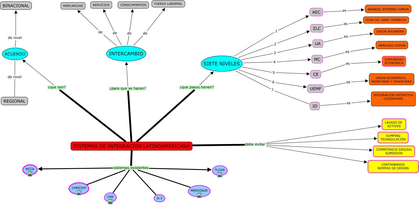 INTEGRAC, AEC es ARANCEL EXTERNO COMÚN, SISTEMAS DE INTEGRACION LATINOAMERICANA ¿para que se hacen? INTERCAMBIO, SIETE NIVELES 7 ID, SISTEMAS DE INTEGRACION LATINOAMERICANA debe evitar CONTRABANDO NORMAS DE ORIGEN, SISTEMAS DE INTEGRACION LATINOAMERICANA ¿que son? ACUERDO, ACUERDO de nivel BINACIONAL, INTERCAMBIO de MERCANCIAS, ID es INTEGRACION DEFINITIVA CIUDADANÍA, SISTEMAS DE INTEGRACION LATINOAMERICANA sistemas existentes G-3, MC es MERCADO COMÚN