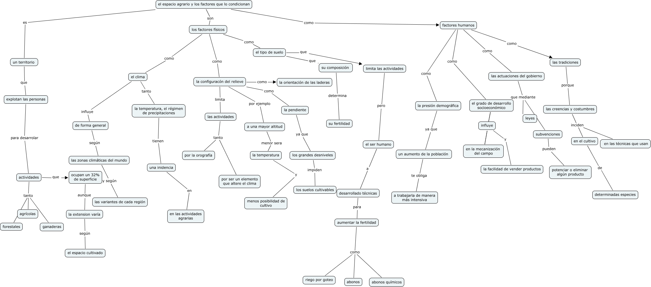 el espacio agrario, un territorio que explotan las personas, los grandes desniveles impiden los suelos cultivables, las zonas climáticas del mundo y según las variantes de cada región, factores humanos como las tradiciones, la extension varía según el espacio cultivado, un aumento de la población te obliga a trabajarla de manera más intensiva, la configuracón del relieve por ejemplo a una mayor altitud, la temperatura y menos posibilidad de cultivo, el grado de desarrollo socioeconómico ???? en la mecanización del campo, los factores físicos como el clima