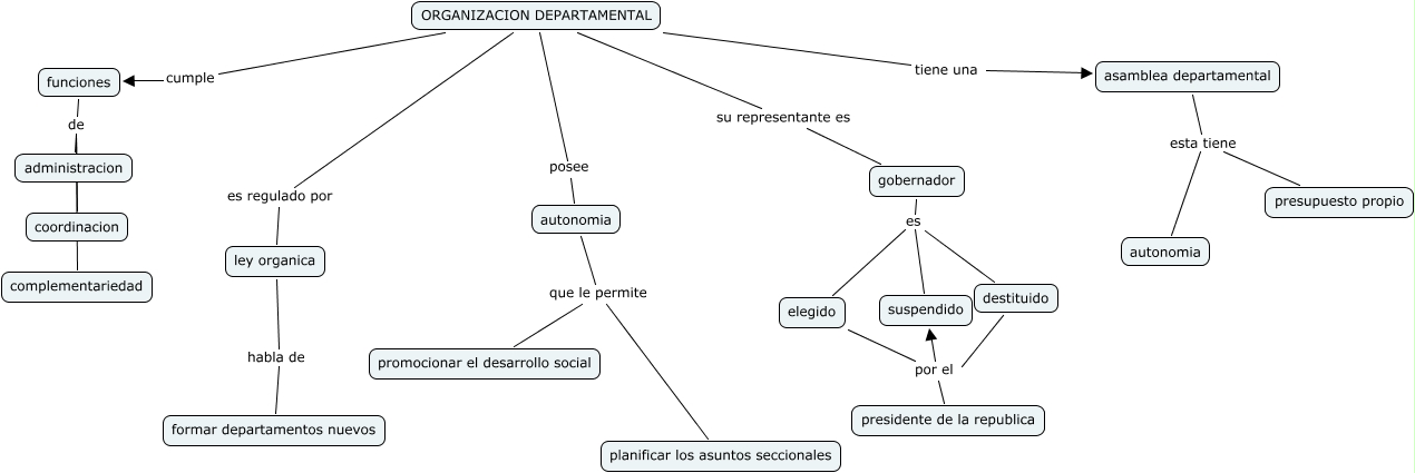 organizacion departamental, asamblea departamental esta tiene presupuesto propio, ley organica habla de formar departamentos nuevos, ORGANIZACION DEPARTAMENTAL es regulado por ley organica, elegido por el suspendido, ORGANIZACION DEPARTAMENTAL su representante es gobernador, destituido por el suspendido, ORGANIZACION DEPARTAMENTAL posee autonomia, autonomia que le permite promocionar el desarrollo social, elegido por el presidente de la republica, gobernador es destituido