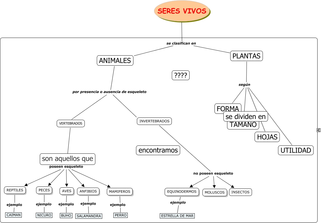 LOS SERES VIVOS, PLANTAS según TAMAÑO, PECES ejemplo NICURO, ANFIBIOS ejemplo SALAMANDRA, EQUINODERMOS ejemplo ESTRELLA DE MAR, PLANTAS según HOJAS, AVES ejemplo BUHO, VERTEBRADOS poseen esqueleto ANFIBIOS, PLANTAS según FORMA, VERTEBRADOS poseen esqueleto REPTILES, PLANTAS según UTILIDAD