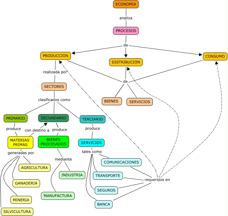 ECONOMIA, DISTRIBUCION de BIENES, COMUNICACIONES requeridos en DISTRIBUCION, PRODUCCION de BIENES, SEGUROS requeridos en CONSUMO, PRODUCCION realizada por SECTORES, CONSUMO de BIENES, CONSUMO de SERVICIOS, PROCESOS de CONSUMO, SECUNDARIO produce BIENES PROCESADOS, MATERIAS PRIMAS generadas por SILVICULTURA