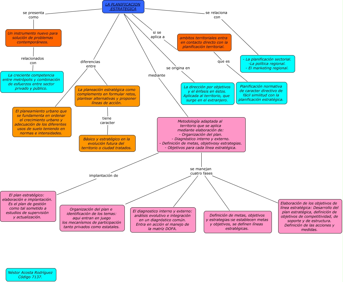 Planificación_Estratégica_II_2006, LA PLANIFICACION ESTRATEGICA se presenta como Un instrumento nuevo para solución de problemas contemporáneos., ambitos territoriales entra en contacto directo con la planificación territorial. que es Planificación normativa de caracter directivo de fácil similitud con la planificación estratégica., Metodología adaptada al territorio que se aplica mediante elaboración de: - Organización del plan. - Diagnóstico interno y externo. - Definición de metas, objetivosy estrategias. - Objetivos para cada línea estratégica. se manejan cuatro fases Organización del plan e identificación de los temas: aqui entran en juego los mecanísmos de participación tanto privados como estatales., LA PLANIFICACION ESTRATEGICA mediante Metodología adaptada al territorio que se aplica mediante elaboración de: - Organización del plan. - Diagnóstico interno y externo. - Definición de metas, objetivosy estrategias. - Objetivos para cada línea estratégica., Metodología adaptada al territorio que se aplica mediante elaboración de: - Organización del plan. - Diagnóstico interno y externo. - Definición de metas, objetivosy estrategias. - Objetivos para cada línea estratégica. implantación de El plan estratégico: elaboración e implantación. Es el plan de gestión como tal sometido a estudios de supervisión y actualización., LA PLANIFICACION ESTRATEGICA diferencias entre El planeamiento urbano que se fundamenta en ordenar el crecimiento urbano y adecuación de los diferentes usos de suelo teniendo en normas e intensidades., LA PLANIFICACION ESTRATEGICA se relaciona con - La planificación sectorial. -La política regional. - El marketing regional., LA PLANIFICACION ESTRATEGICA si se aplica a ambitos territoriales entra en contacto directo con la planificación territorial., La planeación estratégica como complemento en formular retos, plantear alternativas y proponer líneas de acción. tiene caracter Básico y estratégico en la evolución futura del territorio o ciudad tratados., Metodología adaptada al territorio que se aplica mediante elaboración de: - Organización del plan. - Diagnóstico interno y externo. - Definición de metas, objetivosy estrategias. - Objetivos para cada línea estratégica. se manejan cuatro fases Elaboración de los objetivos de línea estratégica: Desarrollo del plan estratégica, definición de objetivos de competitividad, de soporte y de estructura. Definición de las acciones y medidas.