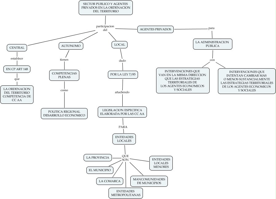 SECTOR PUBLICO Y AGENTES CAPT 2 ALEXANDRA OSPINA ORTIZ, ENTIDADES LOCALES QUE SON ENTIDADES LOCALES MENORES, SECTOR PUBLICO Y AGENTES PRIVADOS EN LA ORDENACION DEL TERRITORIO participacion del AGENTES PRIVADOS, ENTIDADES LOCALES QUE SON MANCOMUNIDADES DE MUNICIPIOS, CENTRAL establece EN CP ART 148, LOCAL dado POR LA LEY 7/85, AGENTES PRIVADOS para LA ADMINISTRACION PUBLICA, SECTOR PUBLICO Y AGENTES PRIVADOS EN LA ORDENACION DEL TERRITORIO participacion del AUTONOMO, LEGISLACION ESPECIFICA ELABORADA POR LAS CC AA PARA ENTIDADES LOCALES, ENTIDADES LOCALES QUE SON EL MUNICIPIO, LA ADMINISTRACION PUBLICA con INTERVENCIONES QUE VAN EN LA MISMA DIRECCION QUE LAS ESTRATEGIAS TERRITORIALES DE LOS AGENTES ECONOMICOS Y SOCIALES