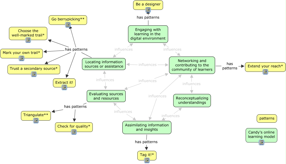Candy's Online Learning Model, Evaluating sources and resources has patterns Check for quality*, Assimilating information and insights has patterns Tag it!*, Locating information sources or assistance has patterns Extract it!, Locating information sources or assistance has patterns Mark your own trail*, Locating information sources or assistance has patterns Trust a secondary source*, Locating information sources or assistance has patterns Go berrypicking**, Engaging with learning in the digital environment has patterns Be a designer, Networking and contributing to the community of learners has patterns Extend your reach*, Evaluating sources and resources has patterns Triangulate**, Locating information sources or assistance has patterns Choose the well-marked trail*