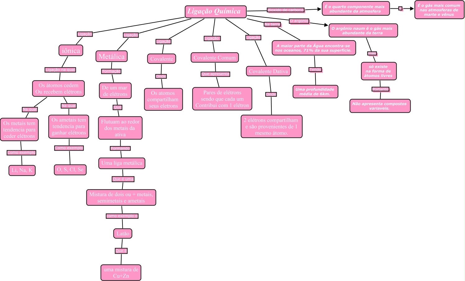 Ligações Quimicas, Ligação Química Na terra A maior parte da Água encontra-se nos oceanos, 71% da sua superficie., Mistura de dois ou + metais, semimetais e ametais como exemplo o Latão, Ligação Química Ligação Covalente Comum, Covalente Comum Que apresenta Pares de elétrons sendo que cada um Contribui com 1 elétron, Os átomos cedem Ou recebem elétrons Na qual Os ametais tem tendencia para ganhar elétrons, Os metais tem tendencia para ceder elétrons Como exemplo Li, Na, K, É o quarto componente mais abundante da atmosfera e É o gás mais comum nas atmosferas de marte e vênus, só existe na forma de átomos livres Portanto Não apresenta compostos variaveis., Os átomos cedem Ou recebem elétrons Na qual Os metais tem tendencia para ceder elétrons, iônica Ligação na qual Os átomos cedem Ou recebem elétrons