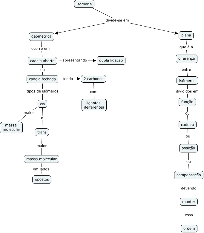 karol olivari, diferença entre isômeros, compensação devendo manter, isômeros divididos em função, 2 carbonos com ligantes deiferentes, cadeira ou posição, função ou cadeira, isomeria divide-se em plana, posição ou compensação, trans maior massa molecular, geometrica ocorre em cadeia aberta
