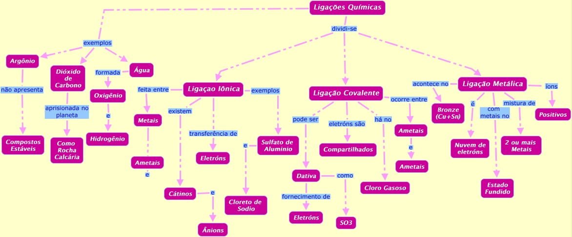 Sem título 1, Ligações Químicas dividi-se Ligaçao Iônica, Dativa fornecimento de Eletróns, Ligação Metálica íons Positivos, Ametais e Ametais, Ligações Químicas exemplos Dióxido de Carbono, Metais e Ametais, Ligações Químicas exemplos Água, Argônio não apresenta Compostos Estáveis, Ligação Metálica com metais no Estado Fundido, Ligação Covalente eletróns são Compartilhados