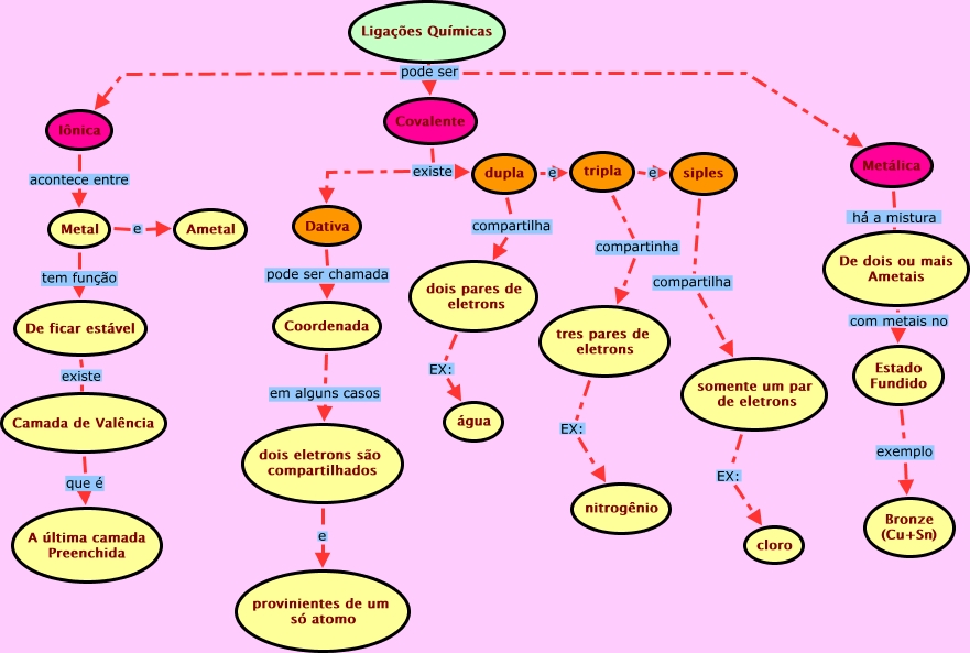 Verena, Coordenada em alguns casos dois eletrons são compartilhados, tres pares de eletrons EX: nitrogênio, dupla e tripla, tripla compartinha tres pares de eletrons, dois eletrons são compartilhados e provinientes de um só atomo, De dois ou mais Ametais com metais no Estado Fundido, siples compartilha somente um par de eletrons, dois pares de eletrons EX: água, tripla e siples, dupla compartilha dois pares de eletrons