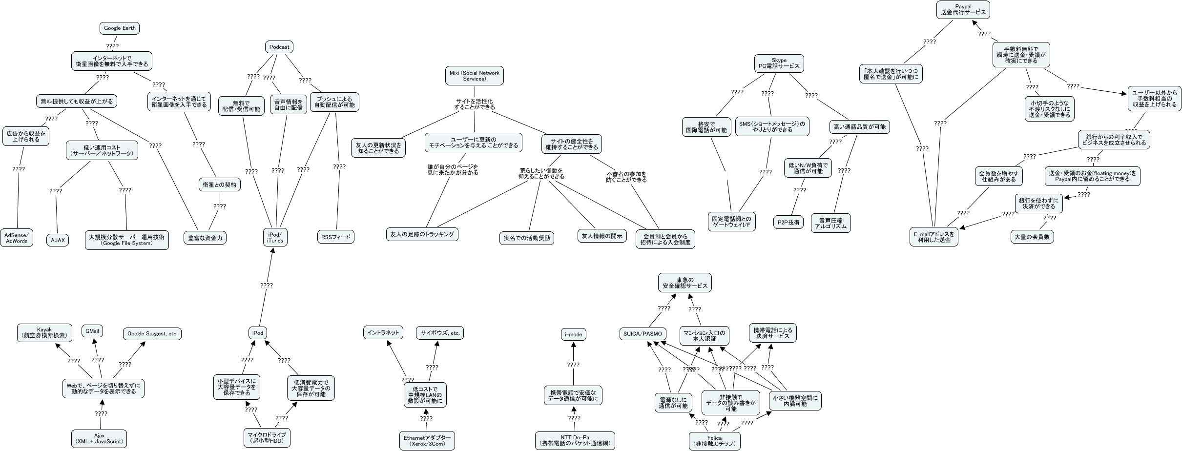 ICSN LAB, サイトの健全性を 維持することができる 荒らしたい衝動を 抑えることができる 実名での活動奨励, 「本人確認を行いつつ 匿名で送金」が可能に ???? E-mailアドレスを 利用した送金, 広告から収益を 上げられる ???? AdSense/ AdWords, Felica (非接触ICチップ) ???? 非接触で データの読み書きが 可能, 低い運用コスト (サーバー/ネットワーク) ???? AJAX, Podcast ???? 無料で 配信・受信可能, Felica (非接触ICチップ) ???? 小さい機器空間に 内臓可能, Ethernetアダプター (Xerox/3Com) ???? 低コストで 中規模LANの 敷設が可能に, Mixi (Social Network Services) サイトを活性化 することができる サイトの健全性を 維持することができる, 手数料無料で 瞬時に送金・受領が 確実にできる ???? Paypal 送金代行サービス