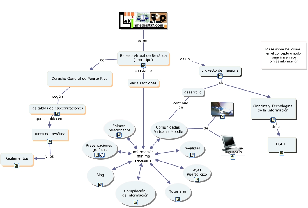 Proyecto Maestría en Ciencias y Tecnologías de la Información, varia secciones información mínima necesaria Tutoriales, Ciencias y Tecnologías de la Información de la EGCTI, Repaso virtual de Reválida (prototipo) es un proyecto de maestría, las tablas de especificaciones que establecen Junta de Reválida, varia secciones información mínima necesaria revalidas, Junta de Reválida y los Reglamentos, Repaso virtual de Reválida (prototipo) de Derecho General de Puerto Rico, Comunidades Virtuales Moodle de Pda, varia secciones información mínima necesaria Comunidades Virtuales Moodle, proyecto de maestría en desarrollo