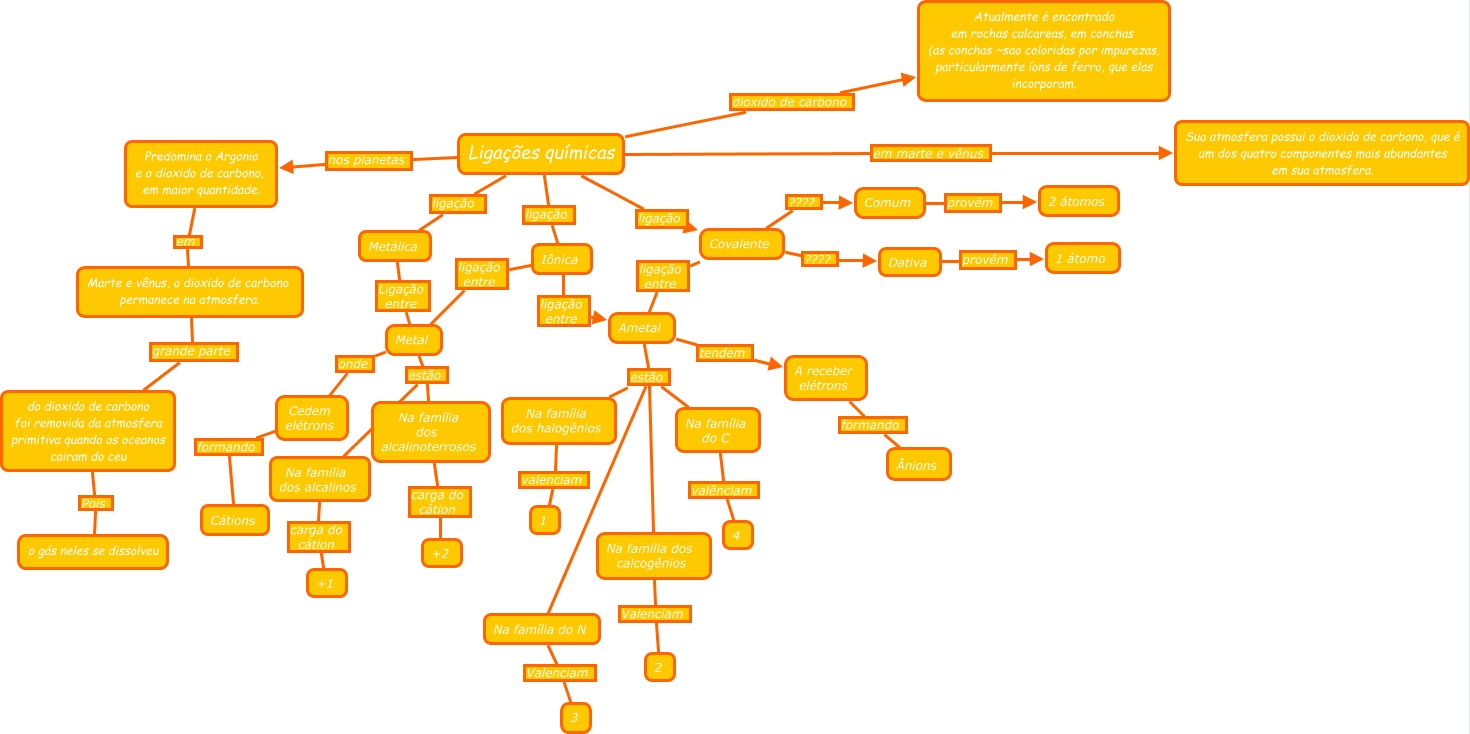 Sem título 1, Ligações químicas ligação Metálica, Na família dos halogênios valenciam 1, Marte e vênus, o dioxido de carbono permanece na atmosfera. grande parte do dioxido de carbono foi removida da atmosfera primitiva quando os oceanos cairam do ceu, Iônica ligação entre Metal, Metal estão Na família dos alcalinos, Dativa provém 1 átomo, Metal estão Na família dos alcalinoterrosos, Comum provém 2 átomos, Ligações químicas dioxido de carbono Atualmente é encontrado em rochas calcareas, em conchas (as conchas ~sao coloridas por impurezas, particularmente íons de ferro, que elas incorporam., Covalente ???? Comum