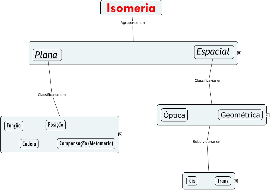 Mapa conceitual de isomeria, Espacial Classifica-se em ????, Plana Classifica-se em ????, Isomeria Agrupa-se em ????, ???? Subdivide-se em ????