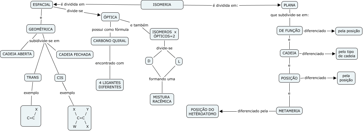 isomeria-gusmão, CADEIA e POSIÇÃO, TRANS subidivide-se em CADEIA FECHADA, CADEIA diferenciado pelo tipo de cadeia, ESPACIAL divide-se ÓPTICA, GEOMÉTRICA subidivide-se em CADEIA FECHADA, GEOMÉTRICA subidivide-se em CADEIA ABERTA, POSIÇÃO diferenciado pela posição, TRANS subidivide-se em CADEIA ABERTA, PLANA que subdivide-se em: DE FUNÇÃO, CARBONO QUIRAL encontrado com 4 LIGANTES DIFERENTES