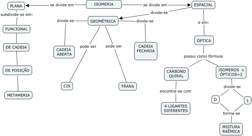 Bruno (b.o)-isomeria, CARBONO QUIRAL possui como fórmula ISOMEROS x ÓPTICOS=2, D forma-se MISTURA RAÊMICA, FUNCIONAL ???? DE CADEIA, GEOMÉTRICA pode ser TRANS, L divide-se D, CARBONO QUIRAL encontra-se com 4 LIGANTES DIFERENTES, GEOMÉTRICA divide-se CADEIA ABERTA, GEOMÉTRICA divide-se CADEIA FECHADA, GEOMÉTRICA pode ser CIS, PLANA subdivide-se em: FUNCIONAL