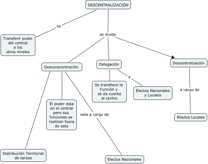 DESCENTRALIZACIÓN, DESCENTRALIZACIÓN se divide Delegación, Descentralización a cargo de Electos Locales, Desconscentración ???? El poder esta en el central pero sus funciones se realizan fuera de este, Delegación a Electos Nacionales y Locales, Desconscentración ???? Distribución Territorial de tareas, DESCENTRALIZACIÓN es Transferir poder del central a los otros niveles, DESCENTRALIZACIÓN se divide Desconscentración, DESCENTRALIZACIÓN se divide Descentralización, Delegación ???? Se transfiere la Función y se da cuenta al centro, Desconscentración esta a cargo de Electos Nacionales
