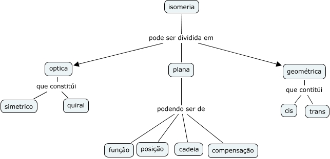 jk, plana podendo ser de cadeia, isomeria pode ser dividida em plana, plana podendo ser de posição, geométrica que contitúi cis, optica que constitúi simetrico, isomeria pode ser dividida em optica, plana podendo ser de compensação, geométrica que contitúi trans, optica que constitúi quiral, isomeria pode ser dividida em geométrica