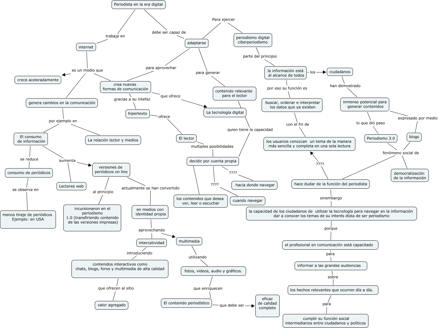 Periodista digital, internet es un medio que crea nuevas formas de comunicación, hace dudar de la función del periodista sinembargo la capacidad de los ciudadanos de utilizar la tecnología para navegar en la información dar a conocer los temas de su interés dista de ser periodismo, contenido relevante para el lector quien tiene la capacidad decidir por cuenta propia, El lector multiples posibilidades decidir por cuenta propia, contenidos interactivos como chats, blogs, foros y multimedia de alta calidad que ofrecen al sitio valor agregado, decidir por cuenta propia ???? los contenidos que desea ver, leer o escuchar, multimedia utilizando fotos, videos, audio y gráficos., hipertexto ofrece El lector, El consumo de información aumenta Lectores web, buscar, ordenar e interpretar los datos que ya existen con el fin de los usuarios conozcan un tema de la manera más sencilla y completa en una sola lectura