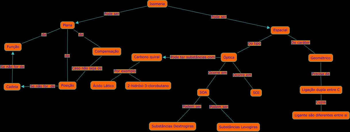 Mapa de Isomeria, Isomeria Pode ser Plana, Plana de Função, SOA Podem ser Substâncias Dextrogiras, Plana de Compensação, Óptica Pode ter substâncias com Carbono quiral, Carbono quiral Por exemplo 2-hidróxi-3-clorobutano, Ligação dupla entre C Cujos Ligante são diferentes entre si, Compensação Caso não seja de Posição, Espacial De caráter Geométrico, Espacial Do tipo Óptica