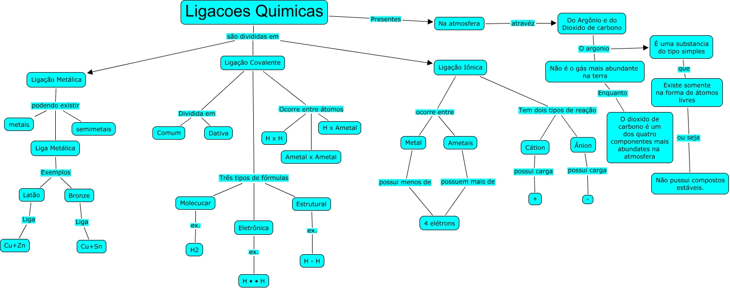 Ligações quimicas, Ligação Iônica ocorre entre Metal, Ligacoes Quimicas Presentes Na atmosfera, Ligação Covalente Dividida em Comum, Molecucar ex. H2, Ligação Covalente Ocorre entre átomos H x Ametal, Na atmosfera atravéz Do Argônio e do Dioxido de carbono, Ligação Iônica Tem dois tipos de reação Ânion, Ligação Covalente Três tipos de fórmulas Eletrônica, Cátion possui carga +, Não é o gás mais abundante na terra Enquanto O dioxido de carbono é um dos quatro componentes mais abundates na atmosfera