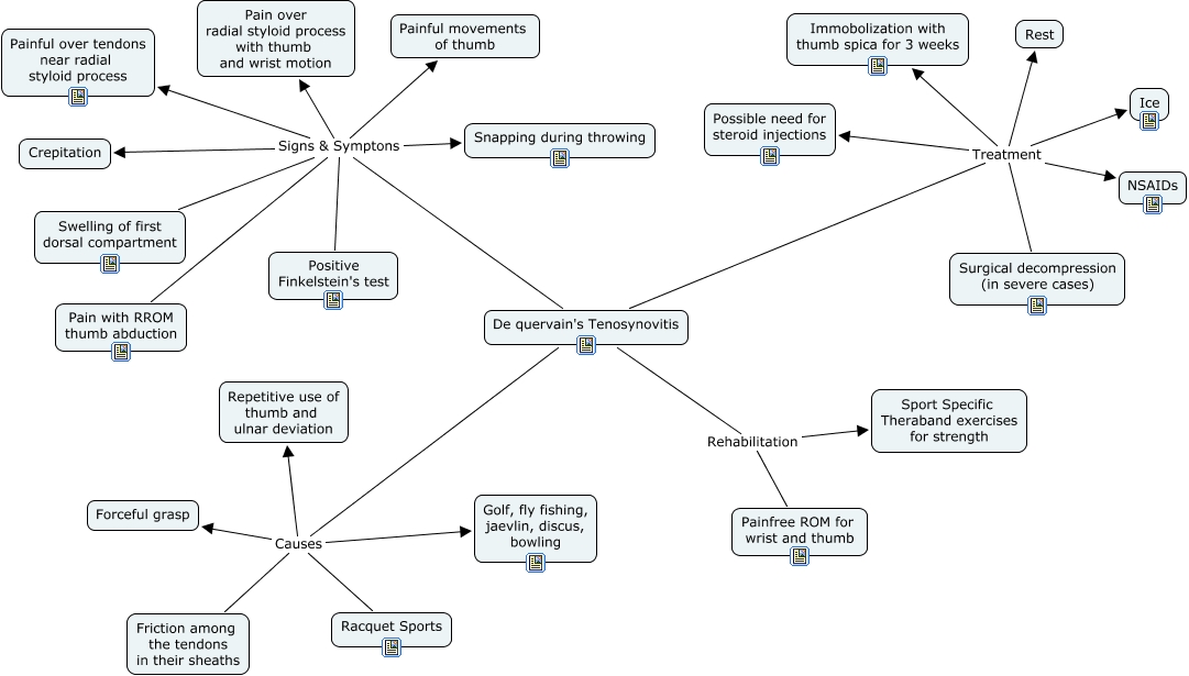 DeQuervain's Tenosynovitis, De quervain's Tenosynovitis Causes Golf, fly fishing, jaevlin, discus, bowling, De quervain's Tenosynovitis Signs & Symptons Snapping during throwing, De quervain's Tenosynovitis Rehabilitation Sport Specific Theraband exercises for strength, De quervain's Tenosynovitis Causes Friction among the tendons in their sheaths, De quervain's Tenosynovitis Causes Forceful grasp, De quervain's Tenosynovitis Signs & Symptons Pain over radial styloid process with thumb and wrist motion, De quervain's Tenosynovitis Treatment Ice, De quervain's Tenosynovitis Treatment Possible need for steroid injections, De quervain's Tenosynovitis Signs & Symptons Painful over tendons near radial styloid process, De quervain's Tenosynovitis Signs & Symptons Crepitation