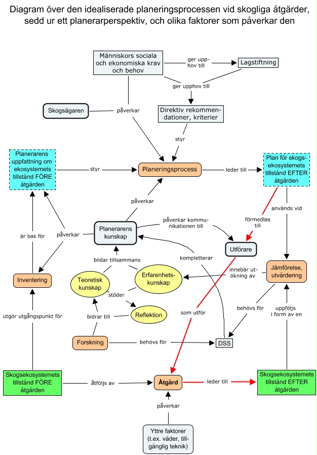 Forest sustainability, Planerarens uppfattning om ekosystemets tillstånd FÖRE åtgärden styr Planeringsprocess, Åtgärd leder till Skogsekosystemets tillstånd EFTER åtgärden, Skogsägaren påverkar Planeringsprocess, Utförare som utför Åtgärd, Skogsekosystemets tillstånd FÖRE åtgärden utgör utgångspunkt för Inventering, Inventering är bas för Planerarens uppfattning om ekosystemets tillstånd FÖRE åtgärden, Lagstiftning ger upphov till Direktiv rekommen- dationer, kriterier, DSS kompletterar Planerarens kunskap, Plan för skogs- ekosystemets tillstånd EFTER åtgärden förmedlas till Utförare, Planerarens kunskap påverkar Inventering