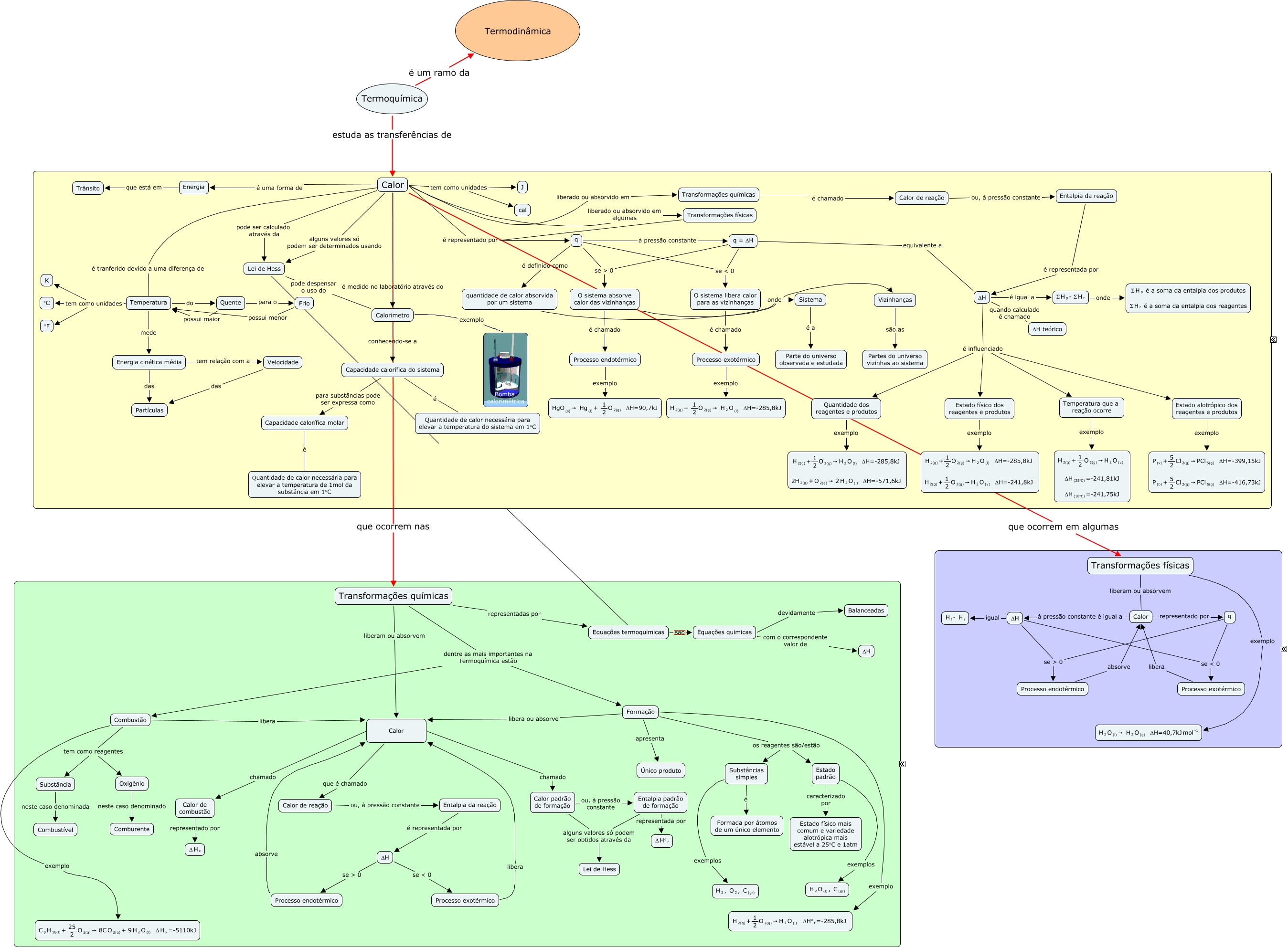 Mapa geral da termoquímica, Temperatura tem como unidades K, Calor de combustão representado por <math xmlns="http://www.w3.org/1998/Math/MathML"> <mrow> <mtext> Δ </mtext> <mmultiscripts> <mtext> H </mtext> <mtext> c </mtext> <none/> </mmultiscripts> </mrow> </math>, Processo endotérmico exemplo <math xmlns="http://www.w3.org/1998/Math/MathML"> <mrow> <mmultiscripts> <mtext> HgO </mtext> <mtext> (s) </mtext> <none/> </mmultiscripts> <mtext> → </mtext> <mmultiscripts> <mtext> Hg </mtext> <mtext> (l) </mtext> <none/> </mmultiscripts> <mtext> + </mtext> <mfrac> <mtext> 1 </mtext> <mtext> 2 </mtext> </mfrac> <mmultiscripts> <mtext> O </mtext> <mtext> 2(g) </mtext> <none/> </mmultiscripts> <mtext> ΔH=90,7kJ </mtext> </mrow> </math>, Calor pode ser calculado através da Lei de Hess, Processo exotérmico libera Calor, q à pressão constante q = ΔH, Calor à pressão constante é igual a ΔH, Energia cinética média das Partículas, Entalpia padrão de formação alguns valores só podem ser obtidos através da Lei de Hess, Calor de reação ou, à pressão constante Entalpia da reação