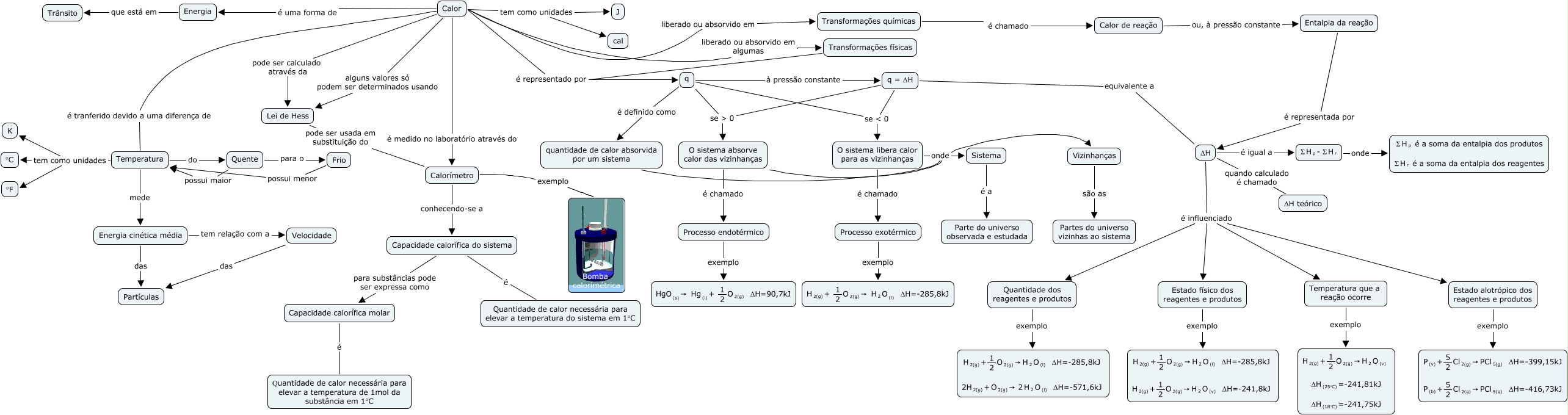 Calor- geral, Calor alguns valores só podem ser determinados usando Lei de Hess, Calor é medido no laboratório através do Calorímetro, Processo exotérmico exemplo <math xmlns="http://www.w3.org/1998/Math/MathML"> <mrow> <mmultiscripts> <mtext> H </mtext> <mtext> 2(g) </mtext> <none/> </mmultiscripts> <mrow> <mtext> + </mtext> <mfrac> <mtext> 1 </mtext> <mtext> 2 </mtext> </mfrac> <mmultiscripts> <mtext> O </mtext> <mtext> 2(g) </mtext> <none/> </mmultiscripts> </mrow> <mtext> → </mtext> <mmultiscripts> <mrow> <mmultiscripts> <mtext> H </mtext> <mtext> 2 </mtext> <none/> </mmultiscripts> <mtext> O </mtext> </mrow> <mtext> (l) </mtext> <none/> </mmultiscripts> <mtext> ΔH=-285,8kJ </mtext> </mrow> </math>, quantidade de calor absorvida por um sistema onde Sistema, Calor é tranferido devido a uma diferença de Temperatura, Estado alotrópico dos reagentes e produtos exemplo <math xmlns="http://www.w3.org/1998/Math/MathML"> <mtable> <mtr> <mtd> <mrow> <mmultiscripts> <mtext> P </mtext> <mtext> (v) </mtext> <none/> </mmultiscripts> <mtext> + </mtext> <mfrac> <mtext> 5 </mtext> <mtext> 2 </mtext> </mfrac> <mmultiscripts> <mtext> Cl </mtext> <mtext> 2(g) </mtext> <none/> </mmultiscripts> <mtext> → </mtext> <mmultiscripts> <mtext> PCl </mtext> <mtext> 5(g) </mtext> <none/> </mmultiscripts> <mtext> ΔH=-399,15kJ </mtext> </mrow> </mtd> </mtr> <mtr> <mtd> <mrow> <mmultiscripts> <mtext> P </mtext> <mtext> (b) </mtext> <none/> </mmultiscripts> <mtext> + </mtext> <mfrac> <mtext> 5 </mtext> <mtext> 2 </mtext> </mfrac> <mmultiscripts> <mtext> Cl </mtext> <mtext> 2(g) </mtext> <none/> </mmultiscripts> <mtext> → </mtext> <mmultiscripts> <mtext> PCl </mtext> <mtext> 5(g) </mtext> <none/> </mmultiscripts> <mtext> ΔH=-416,73kJ </mtext> </mrow> </mtd> </mtr> </mtable> </math>, q = ΔH se < 0 O sistema libera calor para as vizinhanças, Calorímetro conhecendo-se a Capacidade calorífica do sistema, ΔH é influenciado Temperatura que a reação ocorre, Quantidade dos reagentes e produtos exemplo <math xmlns="http://www.w3.org/1998/Math/MathML"> <mtable> <mtr> <mtd> <mrow> <mmultiscripts> <mtext> H </mtext> <mtext> 2(g) </mtext> <none/> </mmultiscripts> <mtext> + </mtext> <mfrac> <mtext> 1 </mtext> <mtext> 2 </mtext> </mfrac> <mmultiscripts> <mtext> O </mtext> <mtext> 2(g) </mtext> <none/> </mmultiscripts> <mtext> → </mtext> <mmultiscripts> <mtext> H </mtext> <mtext> 2 </mtext> <none/> </mmultiscripts> <mmultiscripts> <mtext> O </mtext> <mtext> (l) </mtext> <none/> </mmultiscripts> <mtext> ΔH=-285,8kJ </mtext> </mrow> </mtd> </mtr> <mtr> <mtd> <mrow> <mmultiscripts> <mtext> 2H </mtext> <mtext> 2(g) </mtext> <none/> </mmultiscripts> <mtext> + </mtext> <mmultiscripts> <mtext> O </mtext> <mtext> 2(g) </mtext> <none/> </mmultiscripts> <mtext> → 2 </mtext> <mmultiscripts> <mtext> H </mtext> <mtext> 2 </mtext> <none/> </mmultiscripts> <mmultiscripts> <mtext> O </mtext> <mtext> (l) </mtext> <none/> </mmultiscripts> <mtext> ΔH=-571,6kJ </mtext> </mrow> </mtd> </mtr> </mtable> </math>