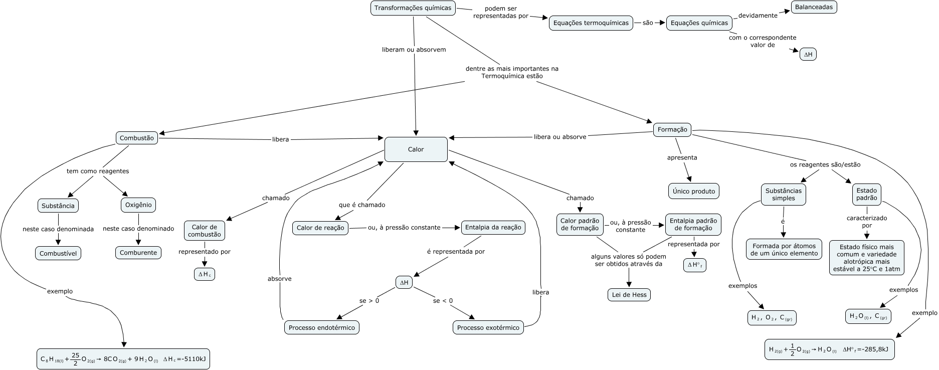 Transformações químicas - geral, Substância neste caso denominada Combustível, Calor de combustão representado por <math xmlns="http://www.w3.org/1998/Math/MathML"> <mrow> <mtext> Δ </mtext> <mmultiscripts> <mtext> H </mtext> <mtext> c </mtext> <none/> </mmultiscripts> </mrow> </math>, Entalpia padrão de formação alguns valores só podem ser obtidos através da Lei de Hess, Calor que é chamado Calor de reação, Calor de reação ou, à pressão constante Entalpia da reação, Transformações químicas liberam ou absorvem Calor, Estado padrão caracterizado por Estado físico mais comum e variedade alotrópica mais estável a 25°C e 1atm, Equações termoquímicas são Equações químicas, ΔH se > 0 Processo endotérmico, Substâncias simples é Formada por átomos de um único elemento