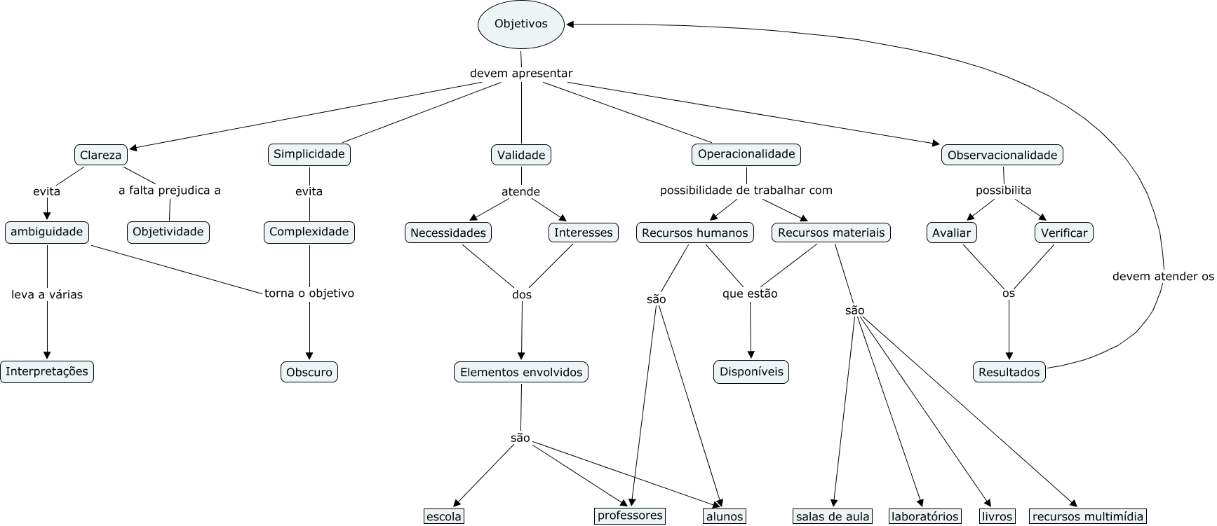 Definição de objetivos, Observacionalidade possibilita Verificar, Recursos humanos são professores, Objetivos devem apresentar Validade, Validade atende Interesses, ambiguidade torna o objetivo Obscuro, Clareza a falta prejudica a Objetividade, Resultados devem atender os Objetivos, Objetivos devem apresentar Simplicidade, Recursos materiais que estão Disponíveis, Simplicidade evita Complexidade