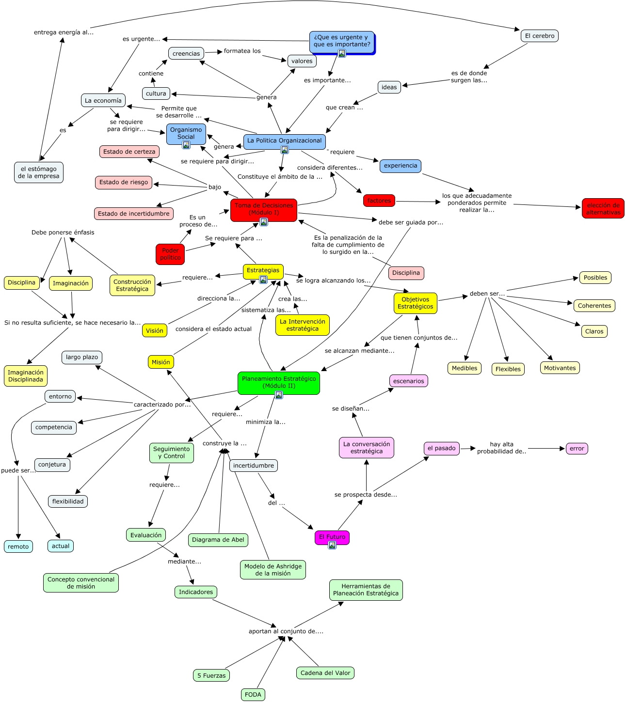 Planificación Estratégica Básica Cmap (PEB Cmap), Toma de Decisiones (Módulo I) considera diferentes... factores, Planeamiento Estratégico (Módulo II) caracterizado por... entorno, Planeamiento Estratégico (Módulo II) minimiza la... incertidumbre, Disciplina Es la penalización de la falta de cumplimiento de lo surgido en la... Toma de Decisiones (Módulo I), Estrategias requiere... Construcción Estratégica, El Futuro se prospecta desde... La conversación estratégica, La Politica Organizacional genera valores, el pasado hay alta probabilidad de.. error, Objetivos Estratégicos deben ser... Coherentes, La Politica Organizacional genera creencias