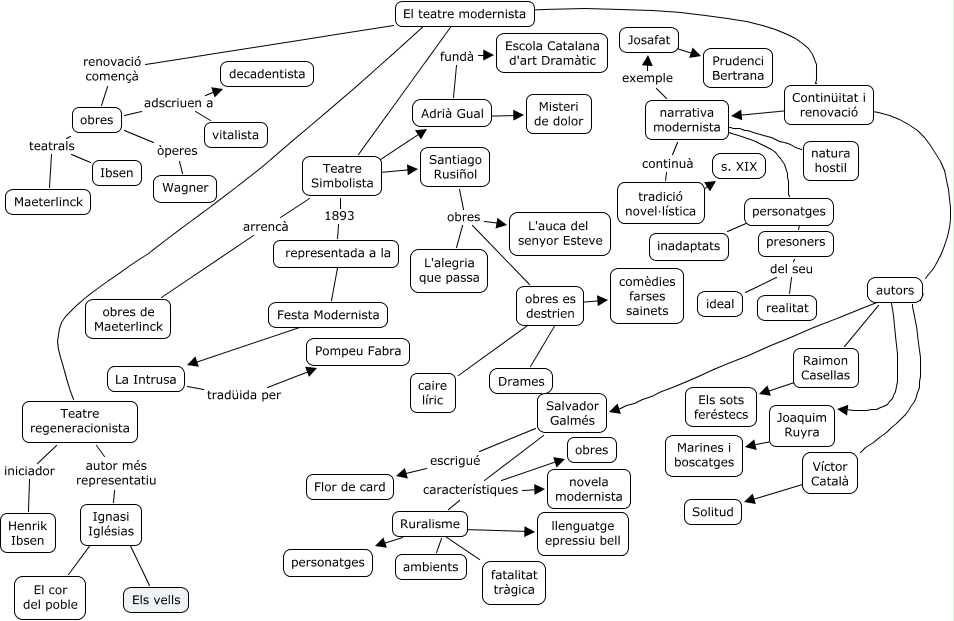 català, El teatre modernista ???? Continüitat i renovació, Salvador Galmés escrigué Flor de card, representada a la ???? Festa Modernista, Adrià Gual fundà Escola Catalana d'art Dramàtic, Festa Modernista ???? La Intrusa, autors ???? Víctor Català, Salvador Galmés característiques obres, Teatre regeneracionista iniciador Henrik Ibsen, narrativa modernista exemple Josafat, Santiago Rusiñol obres obres es destrien
